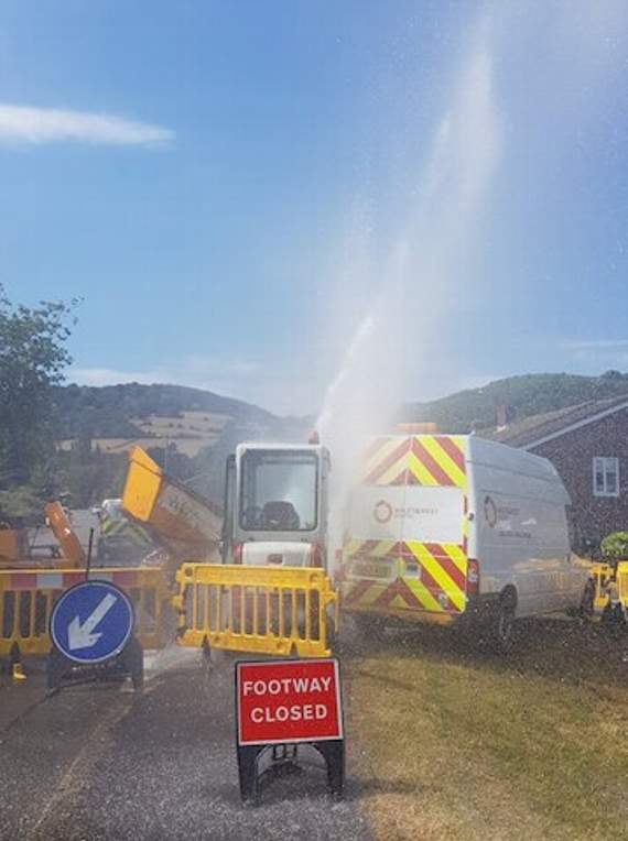 The stream was pumping out of the ground after a six-inch water pipe got severed during routine maintenance earlier today. Contractors believed to be from Wales and West Utilities were said to be digging up sections of road as part of a gas maintenance campaign when the pipe split, sending a thirty-foot cascade pumping into the air.