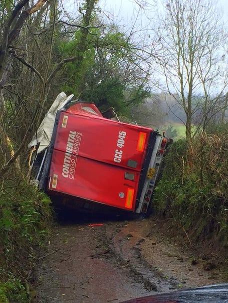 In February an overturned HGV completely blocked a lane in Trostrey for several days, after causing considerable damage to grass verges and stock fencing along the way.